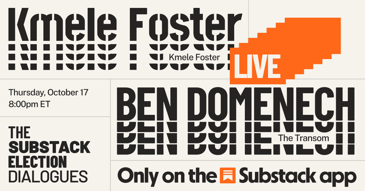 , the author of , here on Substack for a live conversation tonight at 8pm eastern (5pm pacific). We’ll discuss the changing politics of gender, race, and age in the 2024 election. You won’t want to miss it.In the run-up to the 2024 U.S. presidential election, the Substack Election Dialogues are bringing together influential political figures, writers, and commentators for live video conversations, confronting the most consequential questions of the political moment.