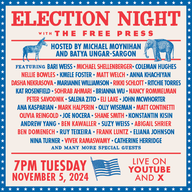 * Finally, I don’t know if I’ll be able to get this link to playably embed, but … you can see that, as advertised, our election night party will be an absolute shitshow of competing livestreams, including our own (deets TK), with about 4,000 people from our broader universe crammed into two adjoining SoHo penthouses…. I predict pain.