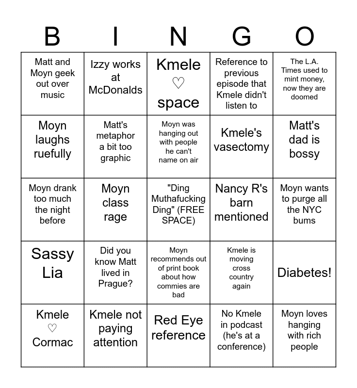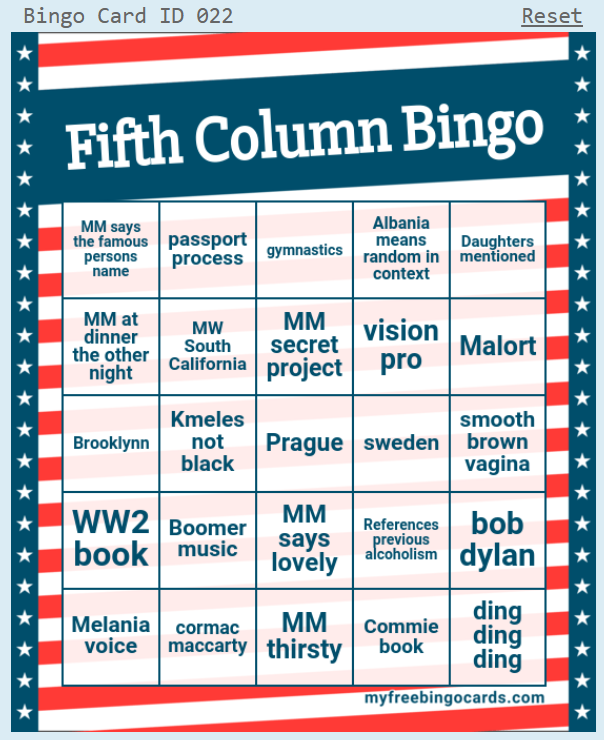 What fresh hell is this? TheNuclearBlonde, it would seem, has created a whole-ass Fifth Column bingo game, which we of course do not condone in any way, especially if there’s gambling and booze involved. Which reminds me of a thing listener Matt P. emailed not long ago: