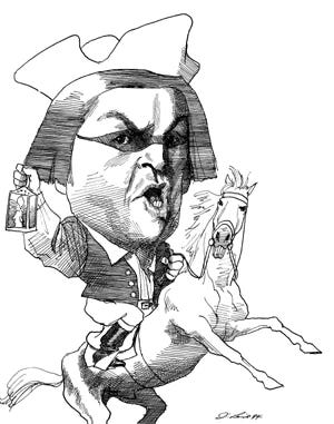 What does this have to do with price of tea in China? Anything you want, man. But also! Our pal & loyal listener Jack Henneman, as those paying subscribers who joined this week’s Second Sunday Zoom know, has been encouraging fellow patriots to put two lights on in the highest window of their abodes Friday night (two if by sea, don’tcha know), and has also posted part one of a promised two-part Revere-sidebar series within his excellent podcast, The History of the Americans.