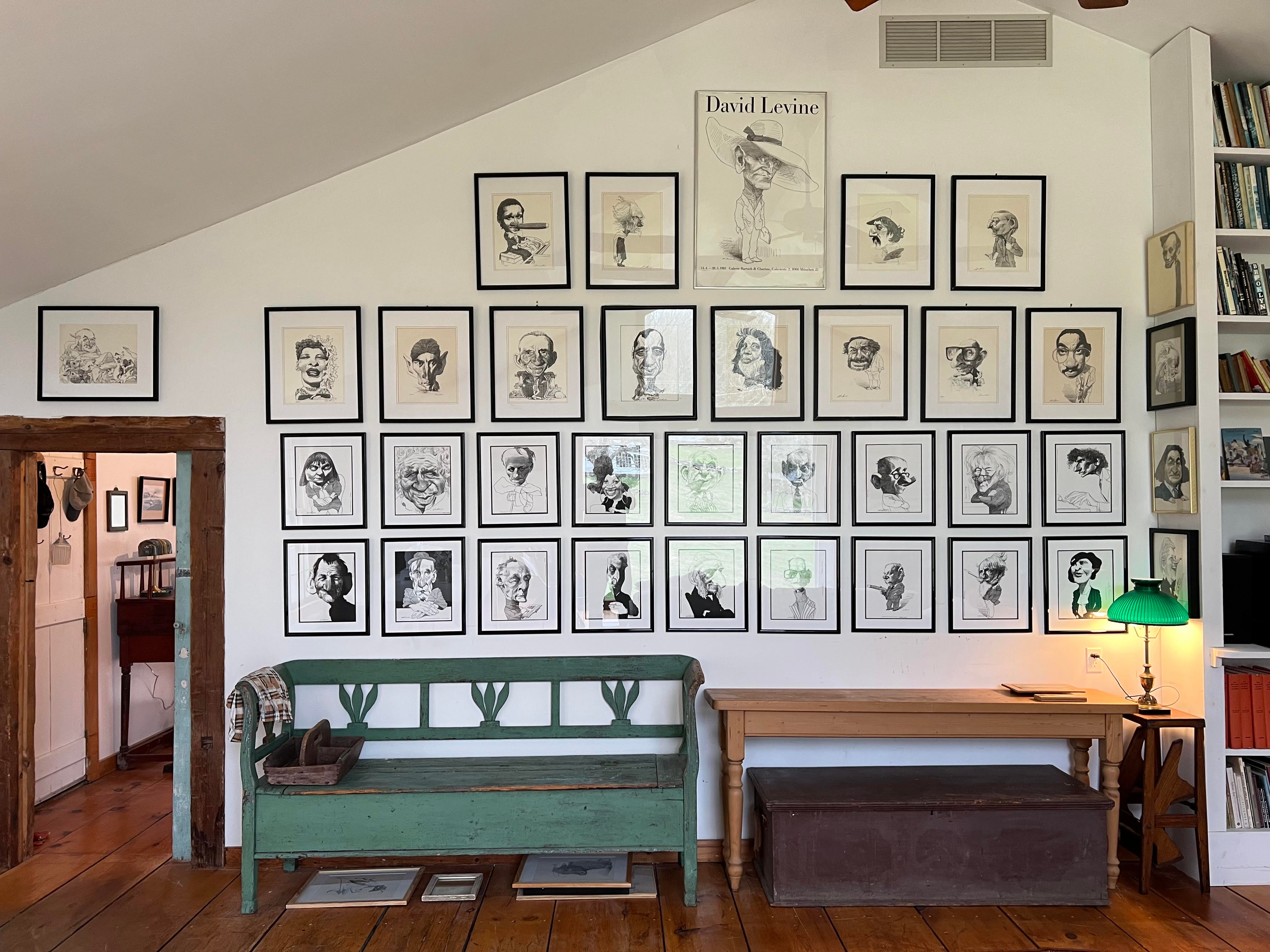 Greetings from the David Levine Memorial Barn Studio, where we’ve been putting the near-finishing touches on the wall displays in the room created for but never fully utilized by America’s greatest 20th century literary/political caricaturist. You have almost certainly seen his work: