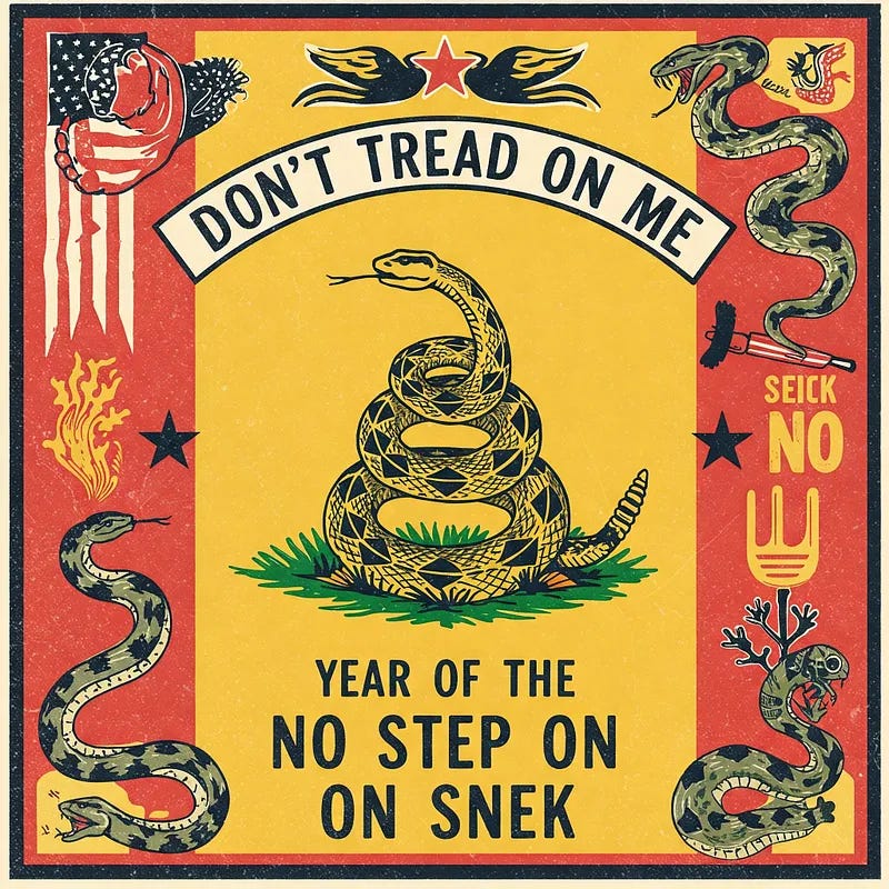 * TheNuclearBlonde, from whom the above image emanates in the Chat (available only to paying subscribers, don’tcha know), informs us that, “Today is a most auspicious day, the anniversary of the legendary ‘No Step on Snek.’” People are sharing memes, outsider art, home decorating choices, Arch Stanton artistry, Chat GPT gospels, something called “The Feast of the Snekan”…. Y’all are mental, you know that, right?