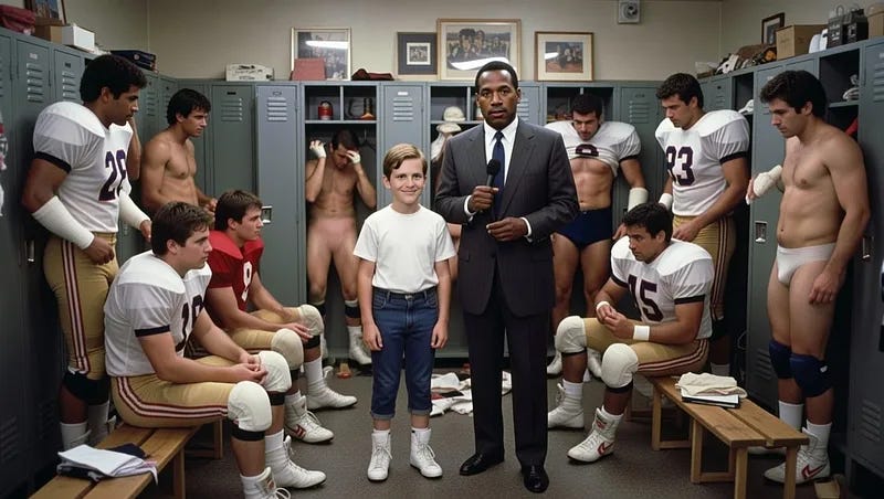 Against all instinct, and to the likely regret of my grandchildren, I clicked on Google News to figure out what is “Moltbook.” Just acres of headlines like, “AI Agents Now Have Their Own Reddit-Style Social Network, and it’s Getting Weird Fast,” and “A Memecoin Related to Moltbook Surged More Than 7,000%,” that kind of thing. Just no, people. See that picture above, attempting to illustrate Moynihan’s traumatic tale of childhood locker-room trauma involving “enormous dongs” and O.J. Simpson? (As exclusively revealed in Members Only #298.) Well, compare that pathetic A.I. attempt to translate listener Adam1775’s perfectly helpful prompts with the actual analog horrors of a delighted Lil’ Hollywood getting felt up by Don Shula: