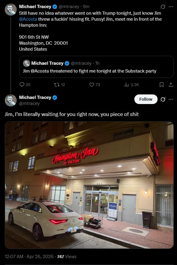 Looks like I picked an excellent year to keep alive my unbroken streak of never coming close to attending the White House Correspondents Dinner. I just can’t stand to witness that kind of violence, by which I obviously mean Michael Tracey squaring off with Jim Acosta.