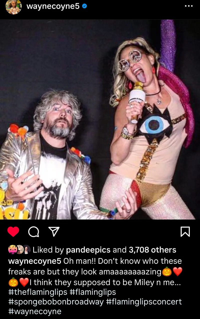But the winner is Matt Wilson & wife, not only for their crackerjack Wayne Coyne/Miley Cyrus Halloween costume, but getting it reposted by the Lead Lips man himself: