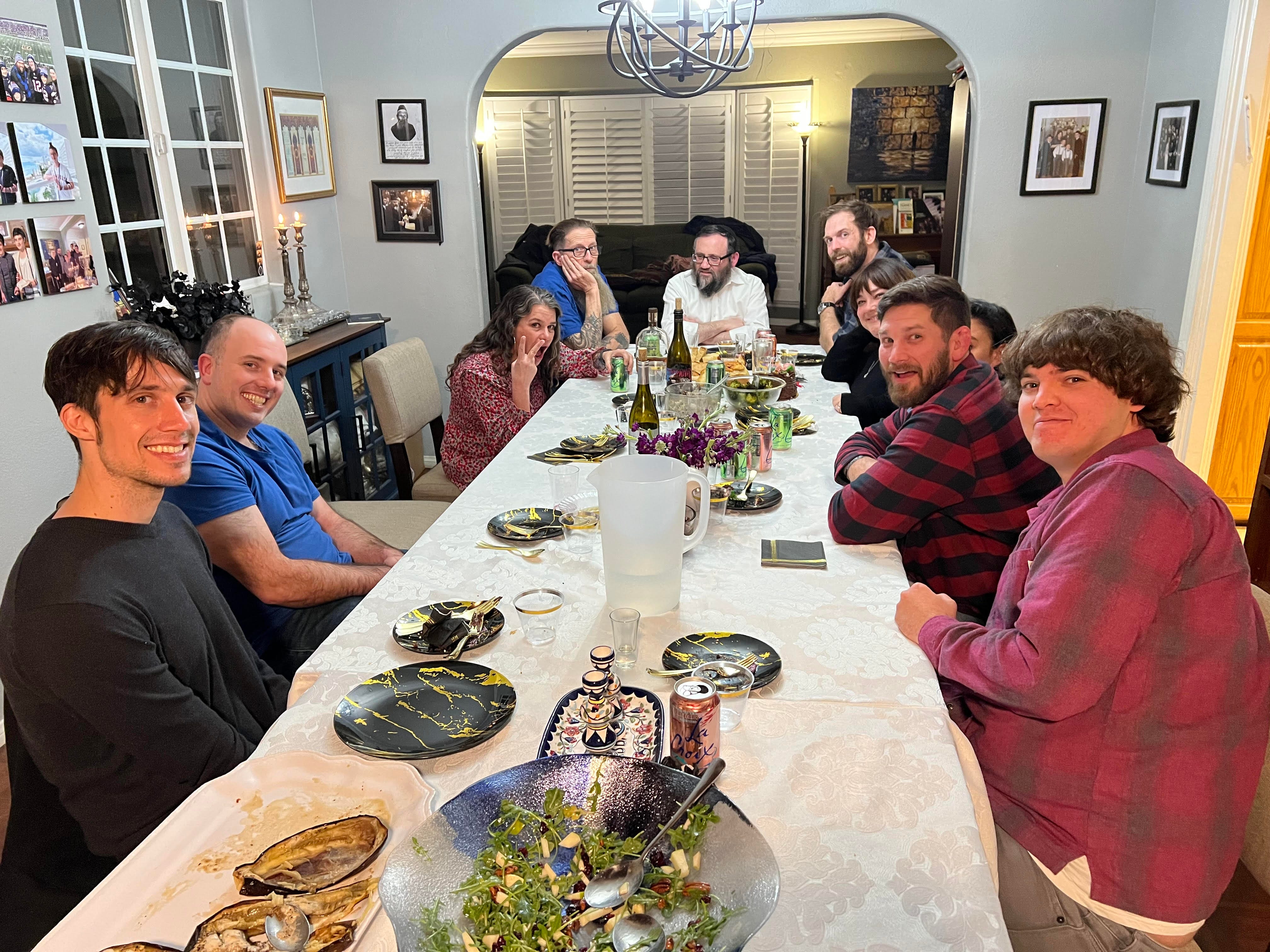 Yes, yes, was a bit of a down week for us, as the lads hopped onto various planes to (respectively) work the conference circuit, sample some Caribbean norovirus, and spend the February school-break communing with the Fifdom at the best damned Shabbat dinner in the LBC or anywhere else (pictured). Thank you so much for your open-hearted generosity, Chaya Leah and Baruch! Happy 40th birthday, Ol’ Man Ben Price! Sorry Coco had to murder your offspring!