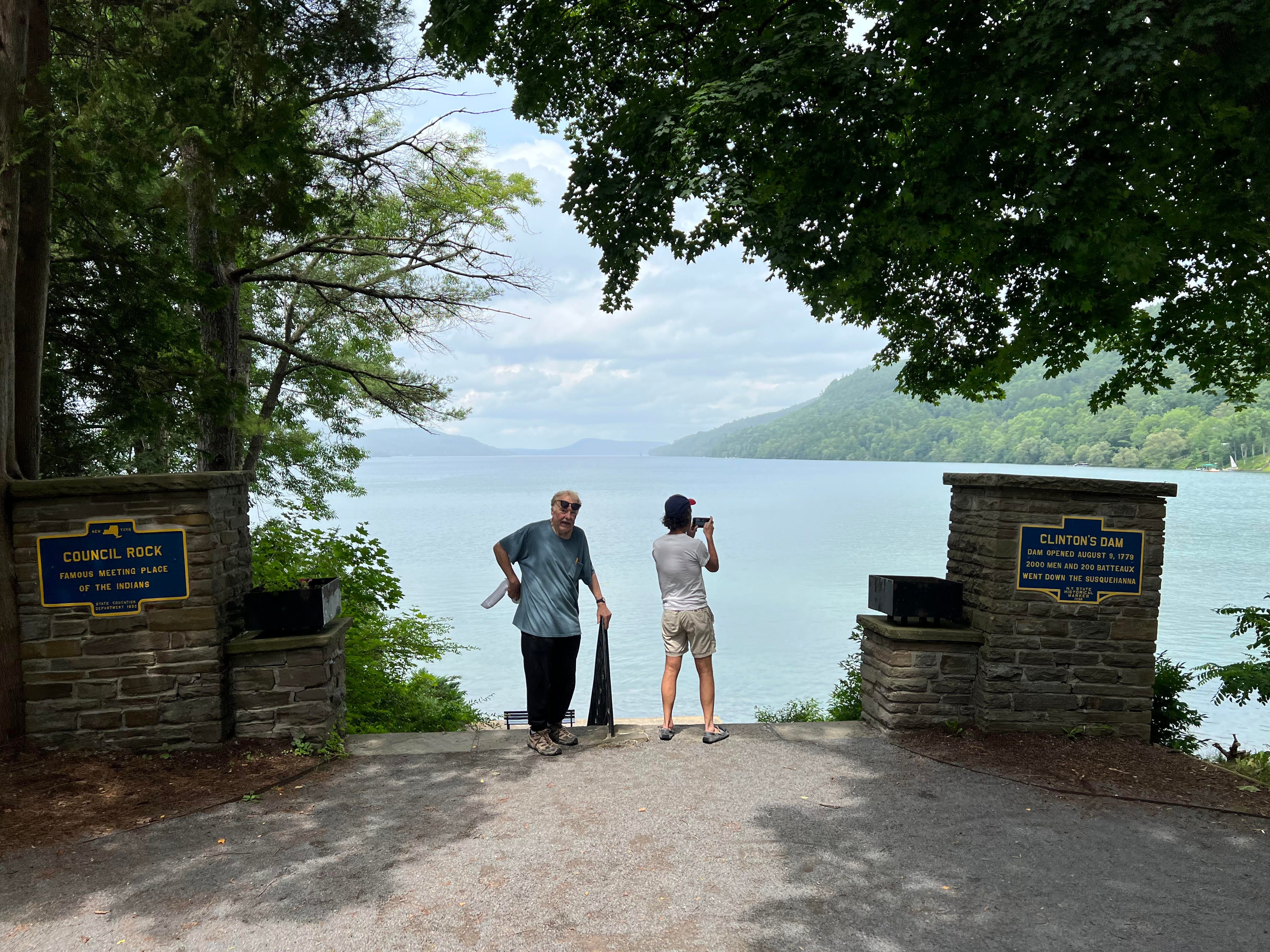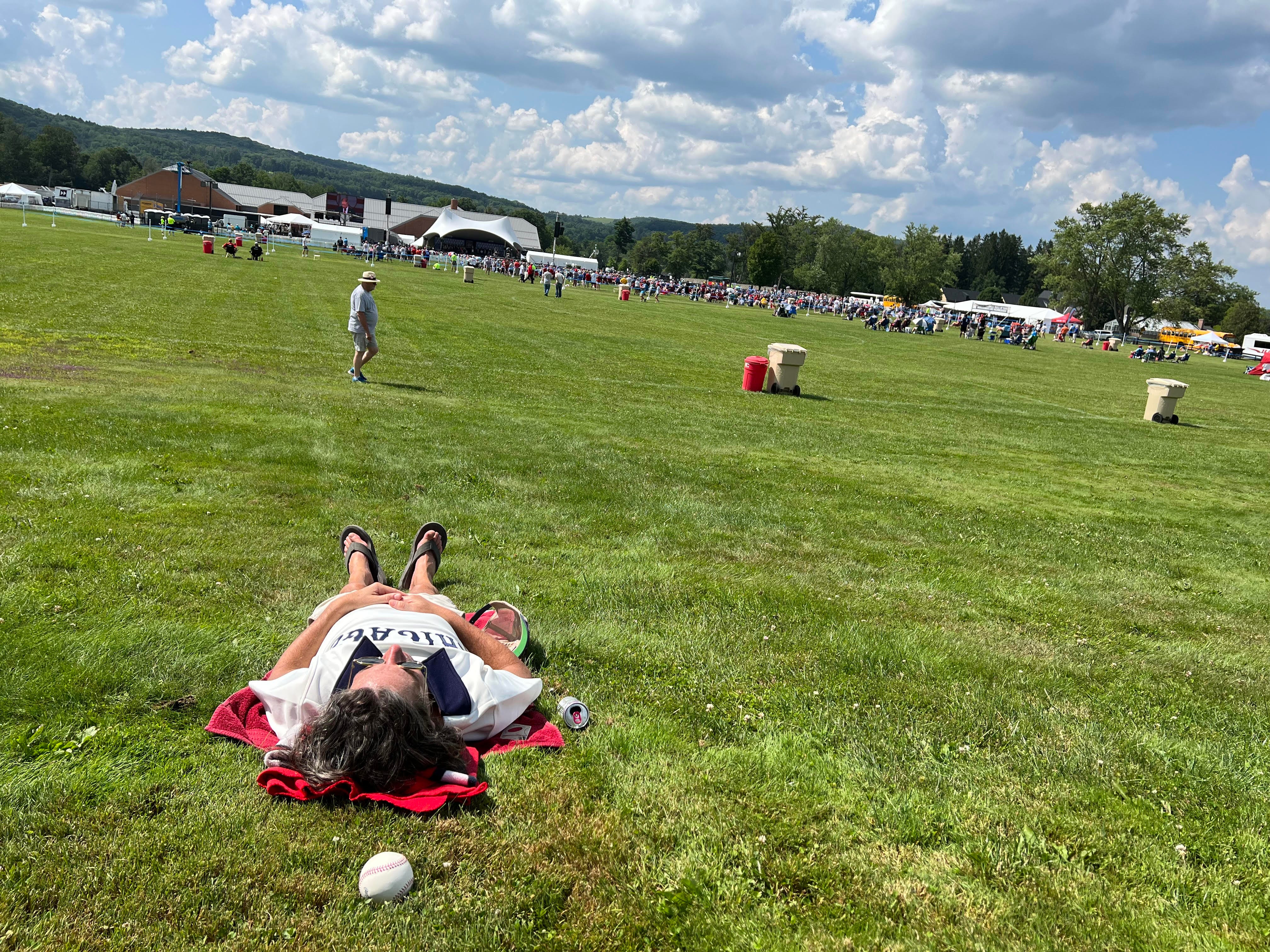 Hi gang! A little text/video post while we clear through some tech/editing issues on our audio backlog…. Sorry to have taken last weekend off, but I just couldn’t peel my eyes away from the sweet ChiSox uni & defiant chicken legs of Bill Schulz (Episode #79, Special Dispatch #72), seen here attempting to burn off the booze-sweat at last Sunday’s Baseball Hall of Fame induction ceremony in Cooperstown, NY. It was our second consecutive year there, which makes this an official Annual Tradition, one that has now expanded to include the entire weekend’s dork-ass festivities, including the inductee parade, Jim Downey walking tour (!!!), and ritual purification in the surprisingly warm waters of Lake Ostego. Obviously made a playlist.
